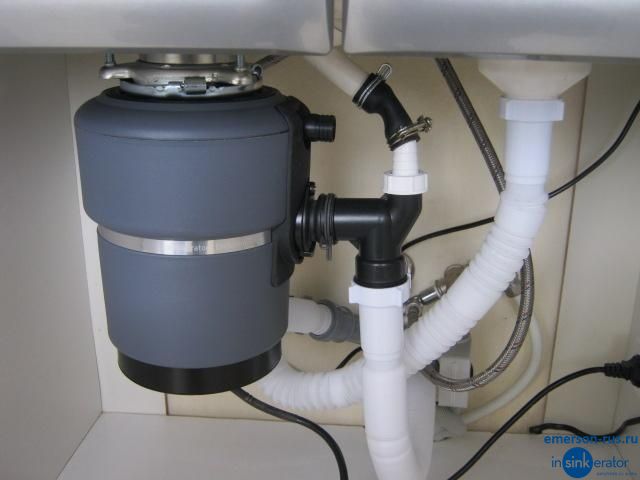 Это проточная модель кухонного измельчителя. Такие устройства обрабатывают поступающие отходы непрерывно. Затем измельченные частицы вместе с водой поступают в канализационную трубу.