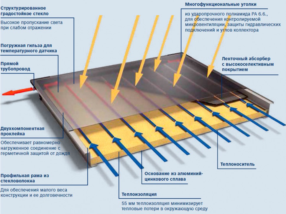 Плоские коллекторы обычно состоят из ряда медных трубок в очень хорошо изолированной стеклянной коробке.Солнечный свет падает на стекло, а тепло удерживается внутри прочной изоляцией. Когда вода или теплоноситель проходит через коллектор, тепло, улавливаемое солнцем, передается жидкости.