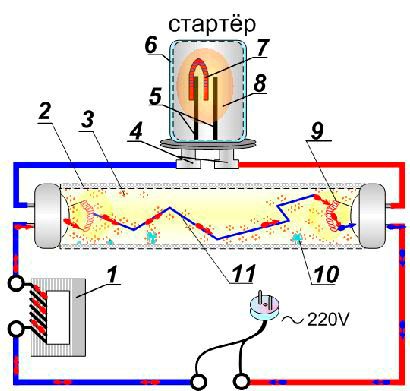 Чтобы поддерживать напряжение для создания тлеющего разряда, схема работы люминесцентных ламп предполагает подключение следующих приспособлений: