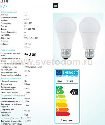 | Светодиодная лампа мощностью 8,5 Вт (эквивалент 60 Вт | Лампа накаливания 60 Вт | |