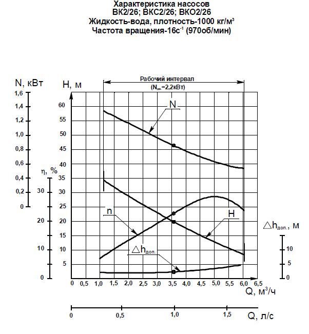 По оси абсцисс в подобных графиках отсчитывается расход в м³/ч, а по оси ординат — напор в метрах. В качестве дополнительной информации на таких графиках отображают данные о КПД насоса и требуемой мощности приводного электродвигателя. Для некоторых серий насосов расход указывают не в м³/ч, а в л/мин.