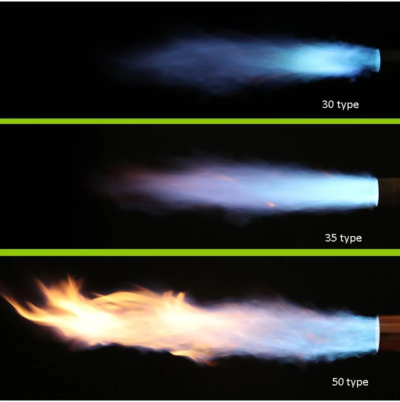 - Синее пламя в сравнении с желтым цветом пламени газа – цвет пламени сжиженного нефтяного газа (пропан) и природного газа (метан)