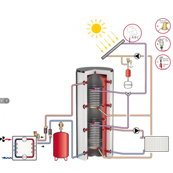 В первом контуре теплоноситель работает по замкнутому кругу, замыкая котёл с тепловым аккумулятором. Во втором контуре теплоноситель нагревается в накопителе тепла. Благодаря буферному накопителю температурные колебания обоих контуров сглажены. Это позволяет предупредить резкие перепады температур.