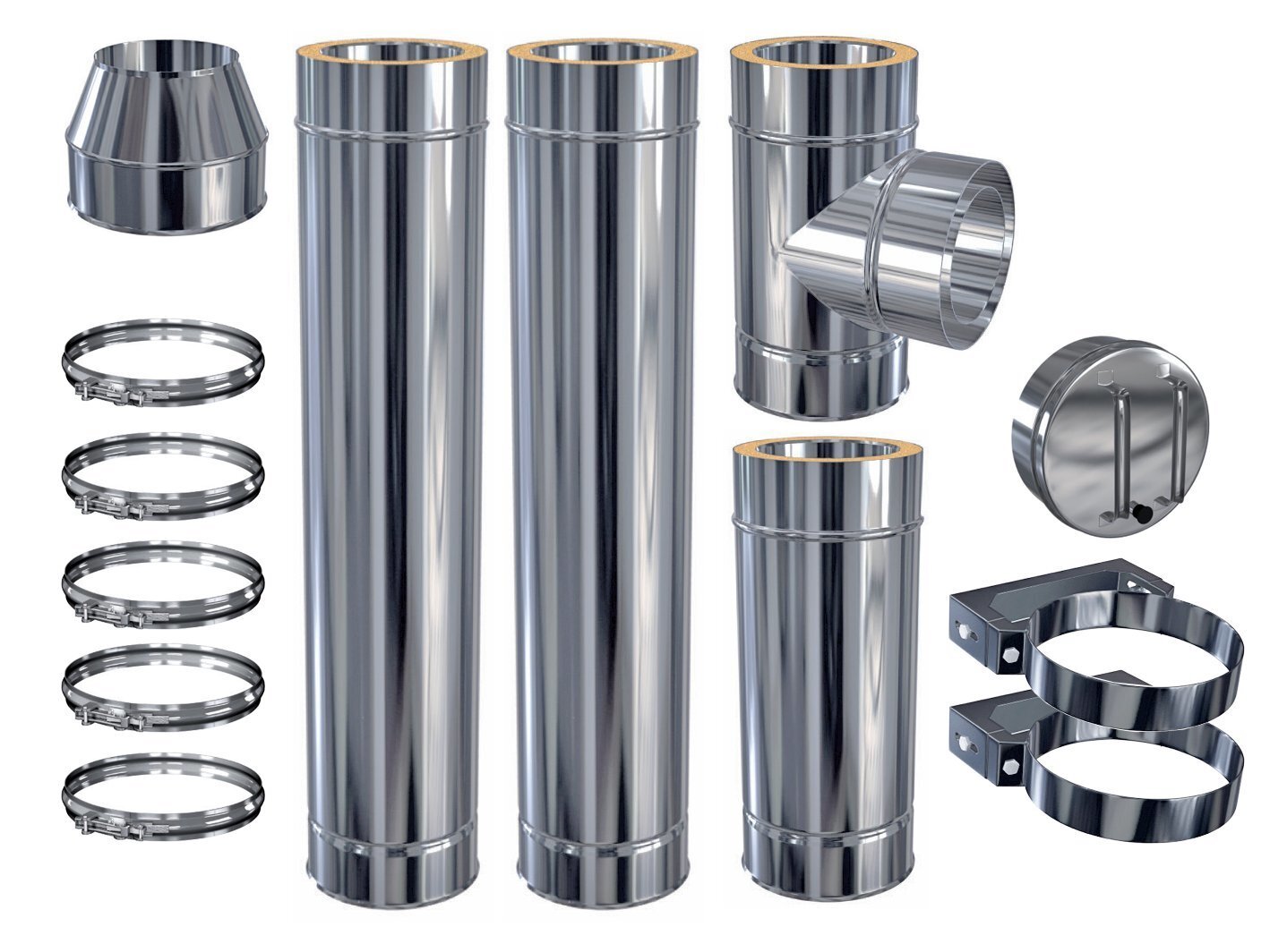 Производители предлагают целый комплект изделий, которые позволяют возвести дымоходы из нержавеющей стали любой длины. Кроме соединительных элементов выпускают целый ряд устройств, значительно облегчающих процесс эксплуатации и обслуживания системы удаления продуктов горения.