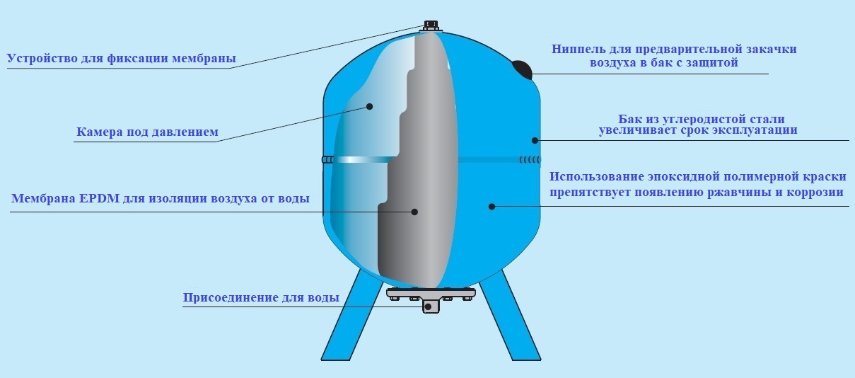В роли разделителя выступает специальная резиновая мембрана – она, как правило, выполнена из крепкого бутила, который устойчив к развитию бактериальных микроорганизмов. Водяная камера оснащена патрубком, через который непосредственно подается вода.