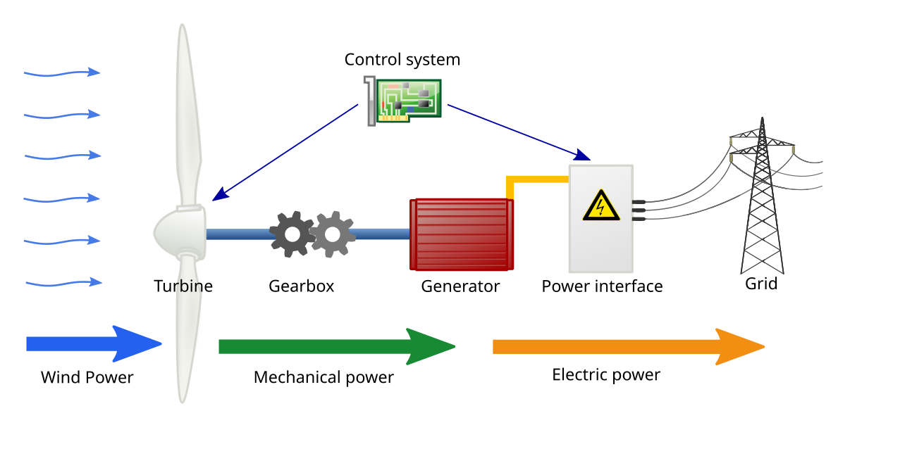 - Энергия ветра преобразуется в механическую с помощью аэротурбины. Эта механическая мощность передается через шестерни на генератор, чтобы увеличить его скорость.Поскольку частота вращения ротора низкая, необходима зубчатая передача, чтобы соответствовать синхронной скорости генератора.
