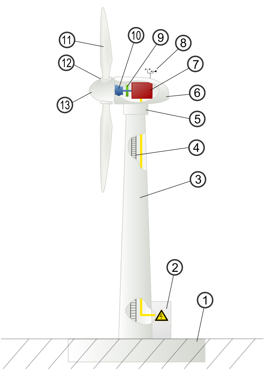 · Трансформатор преобразует напряжение, которое требуется для электрической сети. Трансформатор может быть встроен в башню или расположен у основания башни.