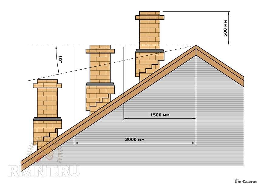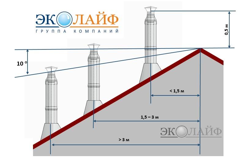 - При удалении дымовой трубы от парапета и конька на расстояние от 1,5 до 3 м ее верхняя точка должна совпадать с уровнем их высоты.
