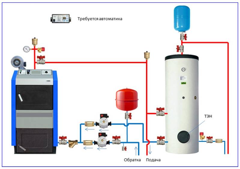 Примерная схема подключения топки с водяным контуром в открытой системе.