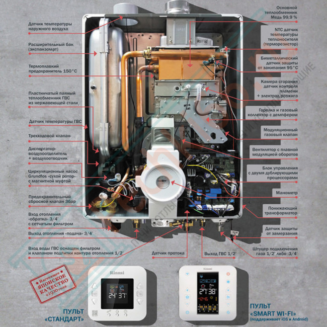 - Устройство работает даже при пониженном давлении газа. Имеет регулируемую горелку из нержавеющей стали, возможность подключения таймера и пульта ДУ.Кроме того, в ТЭН есть система защиты от перегрева, блокировки насоса, а также от замерзания.