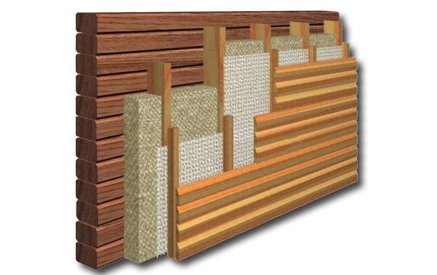 Сначала надо подготовить основание: очистить стены, по возможности заделать трещины в дереве и пустоты в венцах. Древесина должна быть сухой, поэтому утеплять дом минватой лучше всего в теплое время года, подождав неделю-другую после последнего дождя (если это вообще возможно). Потом поверхность грунтуют, следом на саморезы монтируют обрешетку — каркас для утеплителя. На каркас «сажают» плиты утеплителя, следом кладут защитную мембрану, которая убережет минвату от влаги. Наконец, поверх этого «бутерброда» крепится контробрешетка, а на нее — облицовочный материал (например, деревянная вагонка или фасадные панели). У вас получится тот самый вентфасад.
