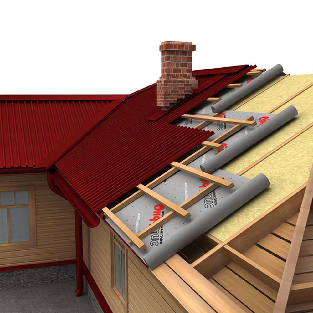 Это специальная армированная паропроницаемая пленка, которая защищает чердачное пространство от конденсата, пыли и случайного попадания дождя или снега. Особенное внимание уделите первой проблеме – именно на металлочерепице и на профнастиле как металлическом материале быстро скапливается конденсат. Ведь металл всегда быстро нагревается и так же быстро остывает, создавая существенную разницу температур предмета и воздуха – идеальные условия для оседания водяных паров в виде капель.