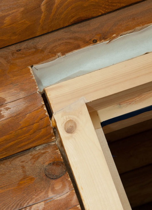 Важно!!! Поскольку сруб «гуляет» постоянно, обычная дверная коробка не выдержит меняющейся нагрузки. Есть специальная технология, по которой на срубе фиксируются только вертикальные детали, что нивелирует его деформацию. Обсадная коробка крепится к каркасу бани только по вертикали
