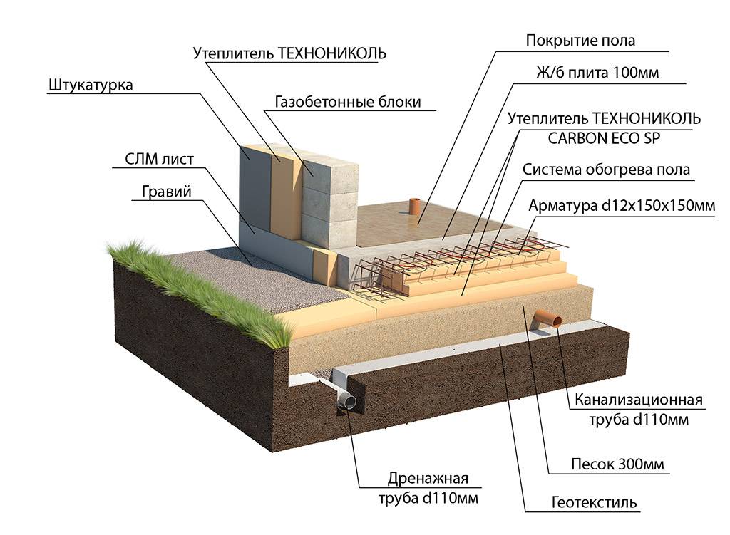 Бетонная плита является «плавающим» основанием. Она имеет сплошную монолитную структуру и располагается под всей площадью здания. Песчано-гравийная подушка амортизирует нагрузки, возникающие в результате морозного пучения почвы. Поверх слоя гравия заливают черновое бетонное основание, на которое раскатывают рулонные или пленочные материалы.