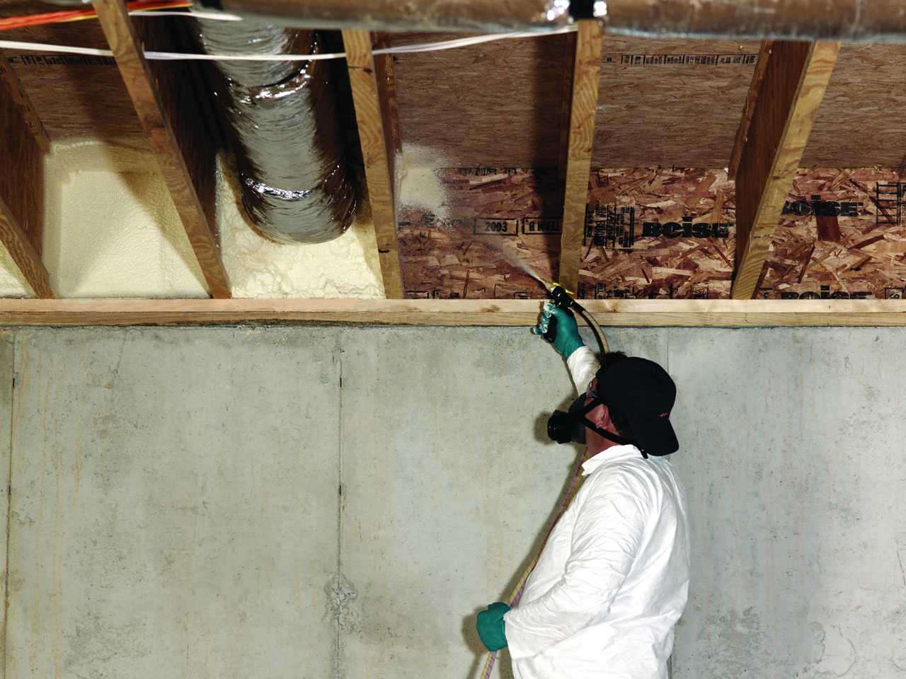 На рис. 3-18 показан подход к внутренней изоляции, выполненный с использованием распыляемой пены вместо панелей из жесткого пенопласта.Сначала на гравийную подушку кладут замедлитель парообразования и приклеивают к стене. Затем пену наносят от пола в подвесном помещении до нижней части чернового пола выше, закрывая подоконник и балку обода. Обод балки также изолирован внешней жесткой пеной на надземных стенах, что сводит к минимуму воздействие низких температур и снижает вероятность повреждения из-за влаги. В этом случае для защиты пены от возгорания наносится одобренное правилами огнестойкое покрытие, такое как вспучивающаяся краска.