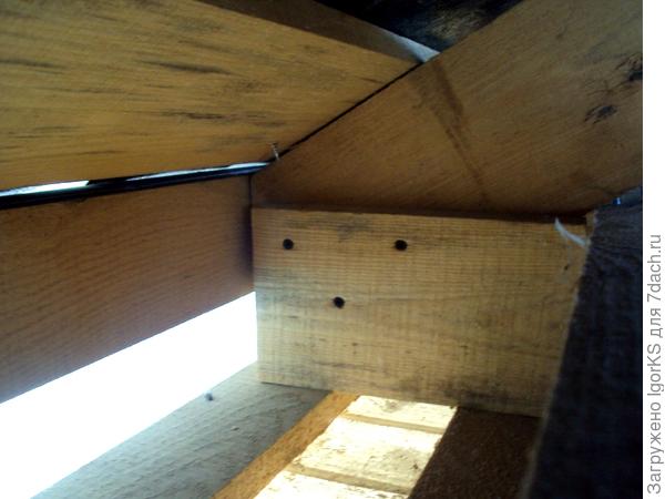 Для этого можно использовать два варианта крепления: стальным уголком и гвоздями. В первом случае стальной уголок прибивается к стропилу тремя или одним гвоздём с каждой стороны в зависимости от необходимой степени подвижности. Второй метод более распространён и предполагает забивание двух гвоздей под прямым углом друг к другу, а третий гвоздь крепится вертикально.
