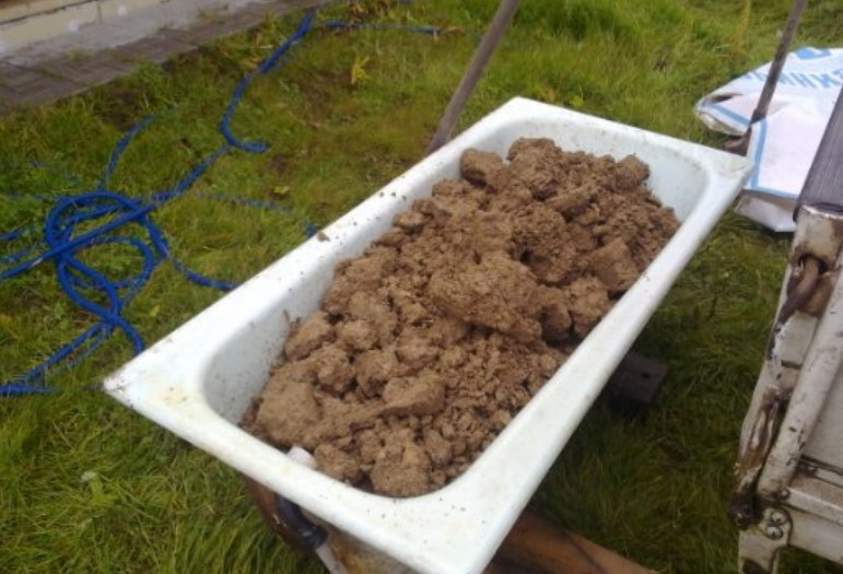 В одной из бочек глина замачивается на несколько часов. Периодически помешивая её, вы увидите, когда масса станет однородной. С помощью ведра перелейте некоторое количество в бетономешалку, добавьте опилки в пропорции 1 ведро глины на 2/3 ведра опилок.